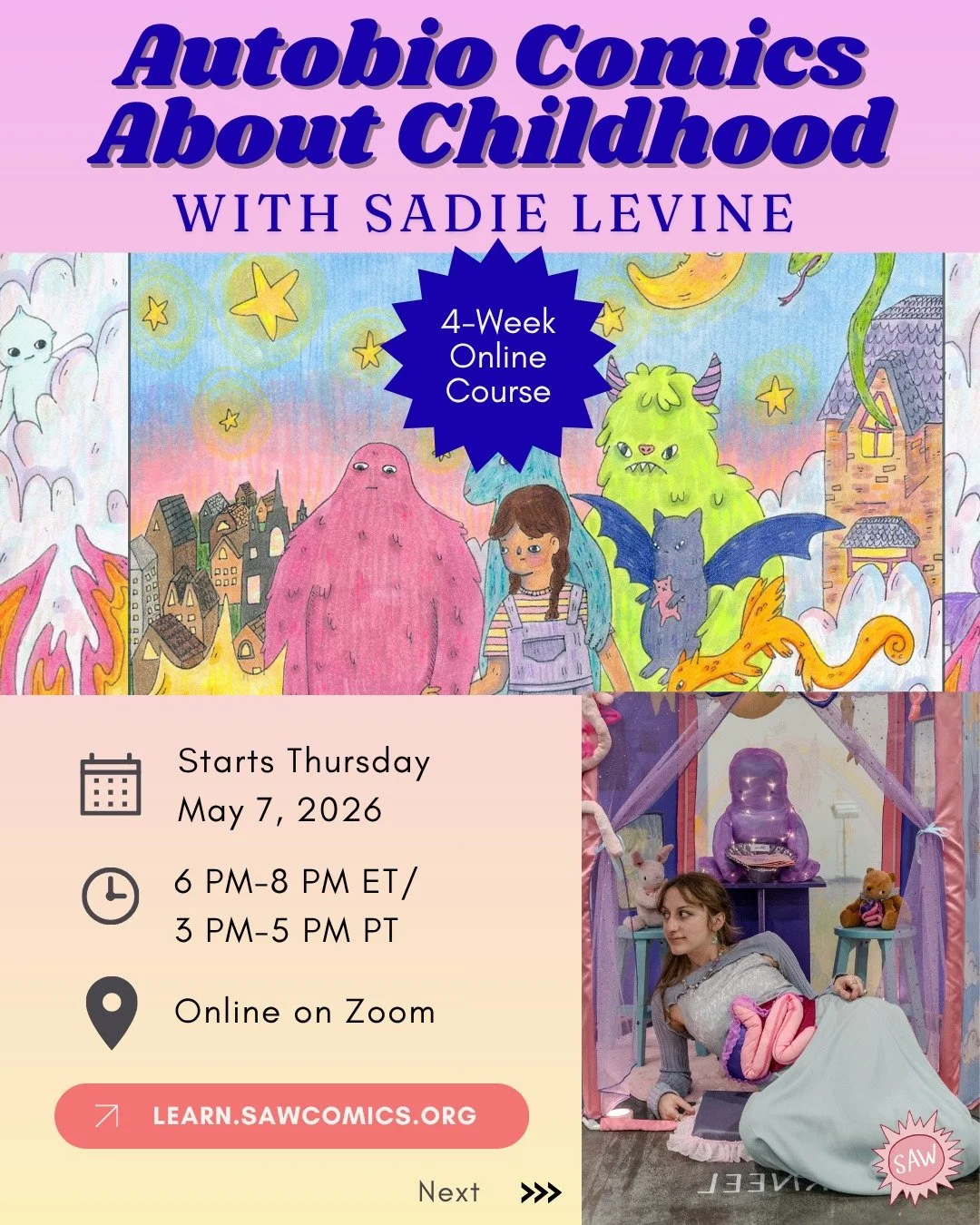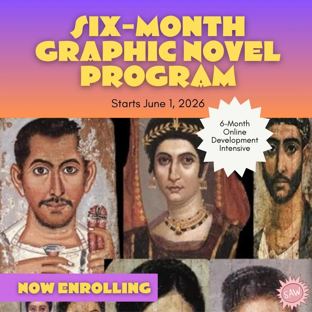 4 weeks exploring childhood memories and imaginative storytelling. Classes on Zoom. Starts May 7. $249SAW Graphic Novel Intensive