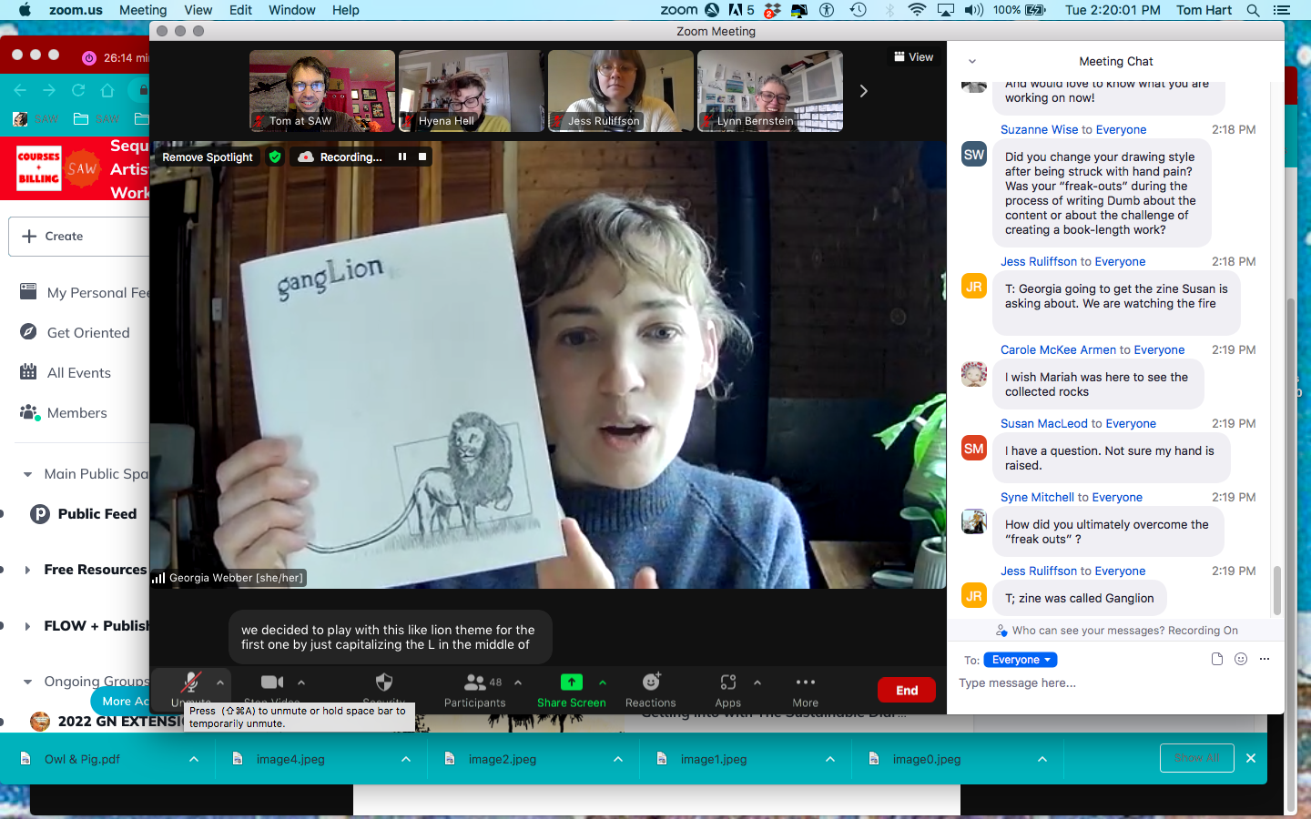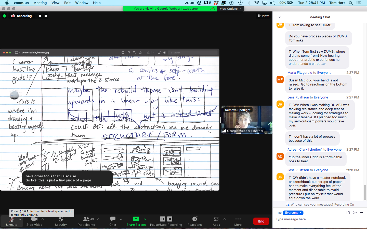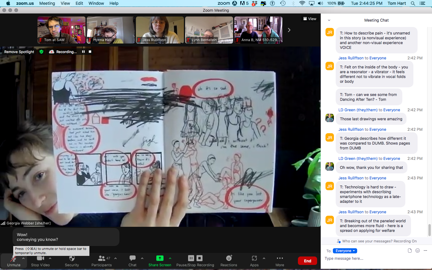 We had a great call with comics artist, health explorer, deep listener and community builder, Georgia Webber this past week! Webber guided us through what drew her to comics; her early work as an editor and designer (including a double zine bound on each side and held together); the process of DUMB, which was heavily thought out but then drawn directly in ink; and her collaboration on Dancing After TEN, in which she was tasked with illustrating the story of Vivian Chong's life with Toxic Epidermal Necrolysis (TEN) and how it eventually affected her vision.