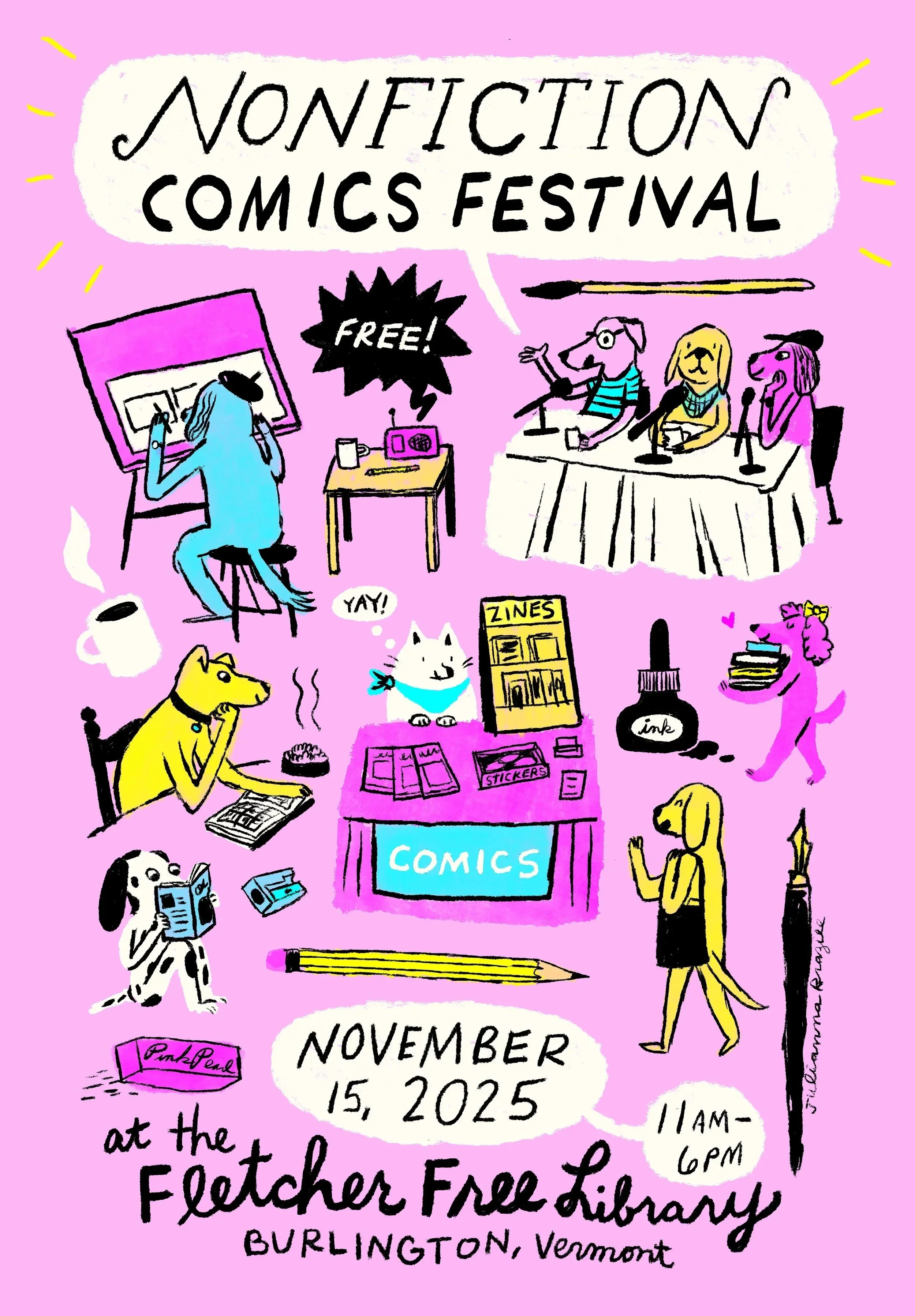 With roots in the Vermont Folklife Center’s Non-Fiction Comics Mini-Fest (2017, 2018 & 2019) and their partnership with the University of Vermont, the Pulp Culture Comic Arts Festival and Symposium (2017 & 2018), NCFS celebrates the full scope of non-fiction cartooning with the Fletcher Free Library in Burlington, Vermont.