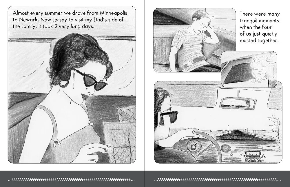 We’ve got lots of projects underway in our Graphic Memoir Intensive group. A few recent works feature “road trips” from the past. These trips might be special journeys of the “once in a lifetime” sort, of a road trip made annually for a family vacation. The different routes of our roots give comics artists plenty to reflect on in the present!